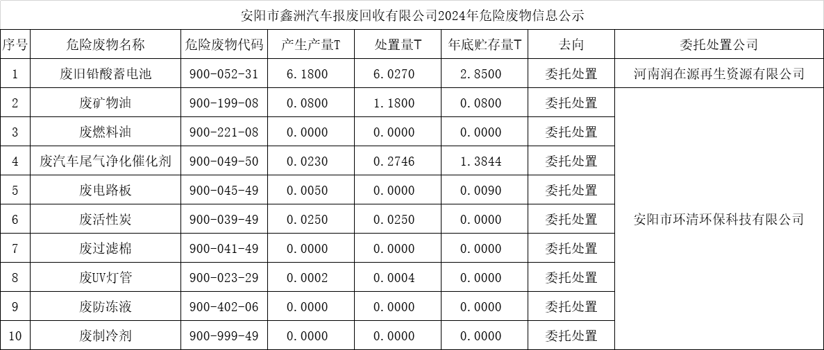 安陽市鑫洲汽車報廢回收有限公司2024年危險廢物信息公示