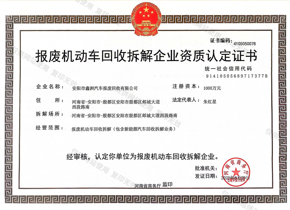 安陽市鑫洲汽車報廢回收有限公司是經(jīng)國家商務(wù)部和省商務(wù)廳批準(zhǔn)備案的報廢汽車回收拆解定點(diǎn)企業(yè)。公司主要從事報廢汽車、黃標(biāo)車的回收拆解,銷售可再生利用的舊汽車配件,辦理報廢汽車回收證明、車輛銷戶、車輛補(bǔ)貼資金申報等。